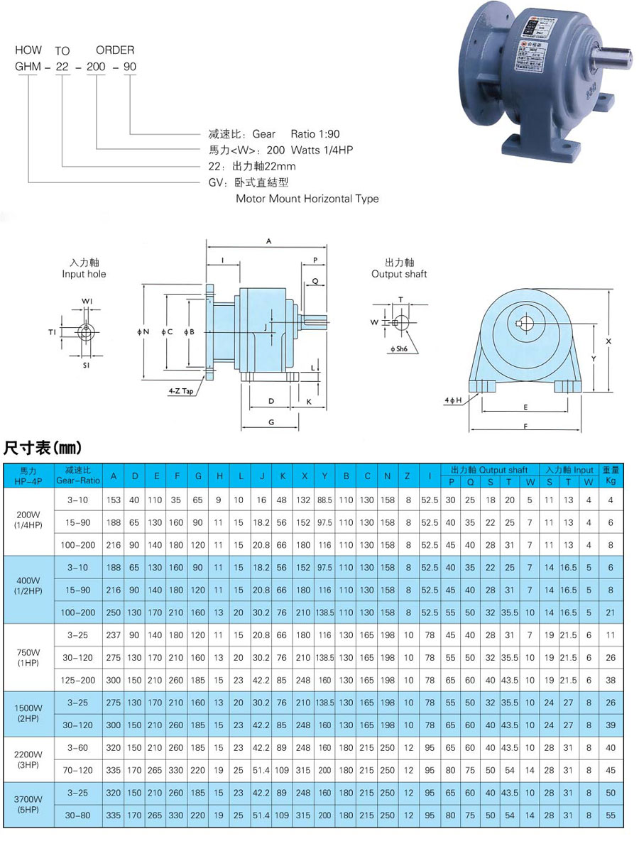 萬(wàn)鑫GH-28減速機(jī)型號(hào):GH18(輸出軸直徑)-100(電機(jī)功率)-20(減速比)S(S代表三相,A代表單相) |